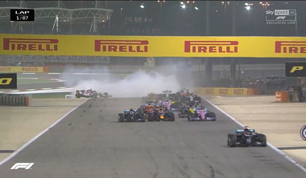 五盏红灯熄灭,萨基尔大奖赛正式起跑,发车的第一弯,拉塞尔凭借强有力的起步一举超越了队友博塔斯,上升到首位,而排在队伍末尾的莱科宁则滑出赛道,所幸他及时将赛车调整回到赛道上,得以继续比赛。