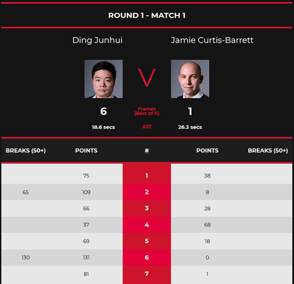 第六局,丁俊晖率先打进红球后做防守。巴雷特防守漏球,丁俊晖趁机上手,单杆打出130分,以131-0零封对手,大比分5-1拿到赛点。第七局,巴雷特率先打进红球,但击打粉球时跳杆失误,被罚6分。丁俊晖打进红球上手,但单杆32分后,黑球不进。巴雷特进攻失误留机会,丁俊晖打进右侧底袋红球再次上手,单杆拿下43分后红球不进,以81-1再胜一局,大比分6-1结束战斗,晋级第二轮。