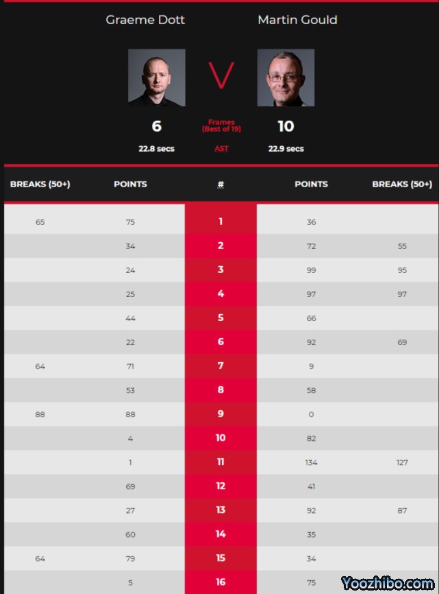 第六局,古尔德再次打出单杆50+(69分)92-22再胜,比分优势已经扩大到5-1。