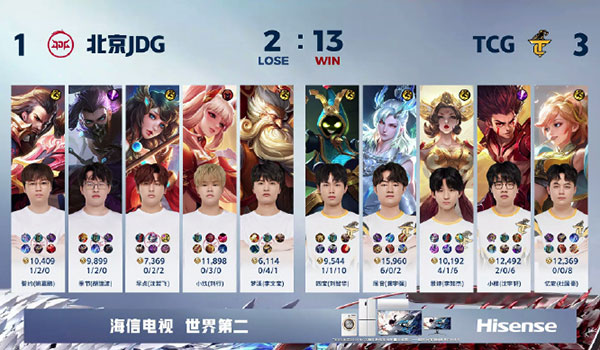 十分半TCG收下暗影暴君,北京JDG开始被动防守,十二分钟北京JDG多人连续掉点,TCG趁机再控一条暗影主宰,双方经济差来到9K。十六分钟北京JDG三高全破只剩水晶,TCG一鼓作气将北京JDG逐个击破几乎团灭,直接点破水晶,拿到本场比赛的胜利!