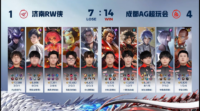 10分40秒,成都AG拿到暗影暴君,推掉对方中路一塔。11分50秒,长生qoq (谢承峻)弈星框到鲁班大师,但随后 RW侠Fly (彭云飞)马超击杀对方中射,济南RW侠打出二换三暂缓局势。13分钟,钟意 (陈家豪)镜单杀安琪拉。14分钟,成都AG推掉下路高地。15分钟,AG一诺(徐必成)蒙犽先杀元流之子,钟意 (陈家豪)镜拿到双杀,成都AG打出一波0换4。15分40秒,成都AG推掉水晶拿到胜利!