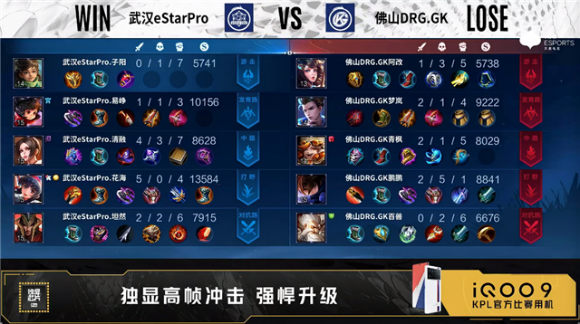 双方常规开局。2分33秒武汉eStar拿下暴君。3分07秒野区团战佛山DRG.GK打出1换2。5分08秒武汉eStar拿下主宰。5分47秒佛山DRG.GK对抗路击杀曜。8分41秒野区团战武汉eStar击杀李元芳。9分04秒武汉eStar野区击杀铠。10分10秒武汉eStar拿下暴君。10分56秒中路团战武汉eStar打出1换3。11分17秒武汉eStar摧毁敌方中路外塔、对抗路二塔。12分53秒武汉eStar中路击杀铠。14分21秒野区团战佛山DRG.GK击杀姜子牙。14分36秒佛山DRG.GK拿下暗影暴君。16分32秒主宰处团战武汉eStar打出1换2。18分29秒武汉eStar拿下暗影暴君。20分23秒佛山DRG.GK拿下鲁班大师。20分37秒佛山DRG.GK抢到风暴龙。20分46秒佛山DRG.GK击杀廉颇。21分13秒佛山DRG.GK摧毁地反搞对抗路高地塔。23分38秒发育路团战佛山DRG.GK打出2换3。24分05秒佛山DRG.GK摧毁敌方发育路高地塔。25分46秒佛山DRG.GK拿下风暴龙王。26分03秒佛山DRG.GK超级兵摧毁敌方水晶拿下比赛。