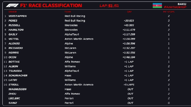 最终,维斯塔潘率先冲线,然后是佩雷斯,二十多秒之后是拉塞尔。从第四到第十的积分车手依次是:汉密尔顿、加斯利、维特尔、阿隆索、里卡多、诺里斯、奥康。