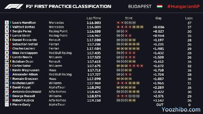 2020年F1匈牙利站FP1成绩: