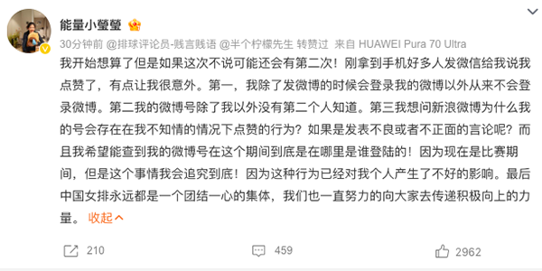点赞事件引争议,李盈莹发文称将追究盗号者,强调女排永远团结