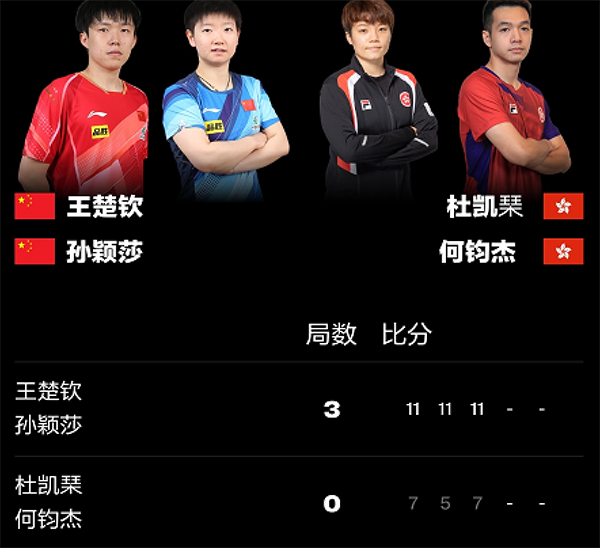 第一盘:王楚钦和孙颖莎3-0何钧杰和杜凯琹
