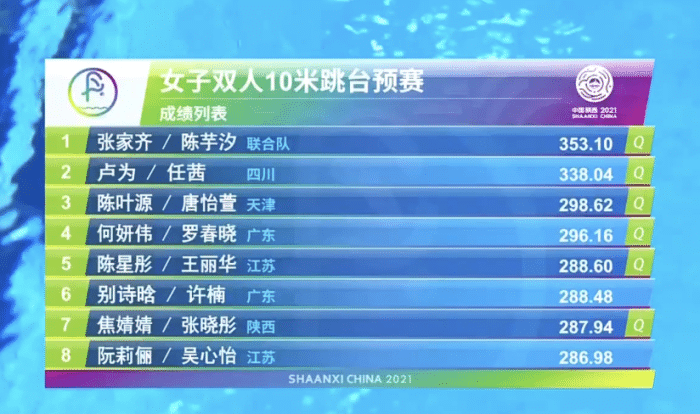 卢为/任茜的第四个动作是难度系数更高的207C,不过完成稍有欠缺,得到81.18分。张家齐/陈芋汐拉开差距。最后一条5253B,张家齐/陈芋汐的发挥依然稳健,拿到79.68分。而卢为/任茜这一动作拿到77.76分。最终,张家齐/陈芋汐总分353.10分,排名预赛第一。卢为/任茜338.04分排名第二。