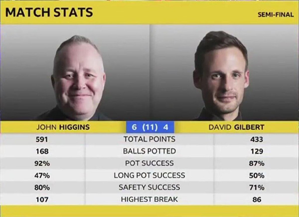 在第七场比赛中,吉尔伯特稳定了局势,并多次赢得83-14。在第八场比赛中,希金斯错过了机会,并输掉了最后的胜利粉红球。吉尔伯特完成了59-56的净空逆转,成功将比分提高到4-4。