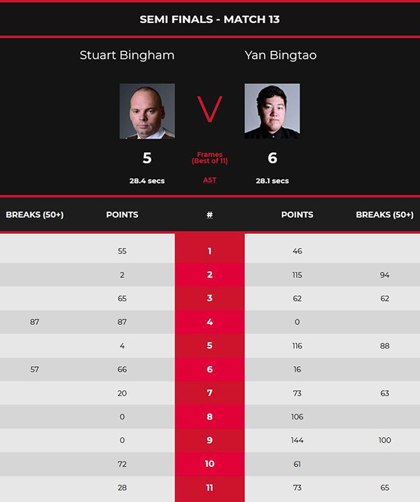 决胜局中,颜丙涛拼进一杆长台上手,连得7分后中袋蓝球出现失误,随后宾汉姆拿下8分后反切底袋红球失误。颜丙涛获得非常好的上手机会,单杆拿下65分超分后中断,随后宾汉姆连得16分后最后一颗红球做斯诺克。颜丙涛被罚掉一杆,随后拼进红球拿下这局,总分6-5颜丙涛连续三场上演绝杀好戏,成功挺进大师赛决赛。