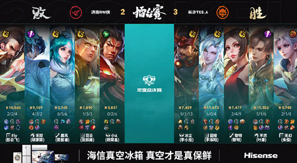 第四局,TES进攻性极强,充分利用大乔的转线优势逼团。然而,十一分钟红区团战中,Fly的夏洛特抓住机会切掉敌方后排,RW侠更是打出零换四顺势平推。济南RW侠再下一城,追平比分。本局MVP为RW侠Fly的夏洛特。