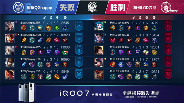 双方和平开局。2分08秒,杭州LGD拿下暴君,重庆QG拿下先知主宰。2分49秒,重庆QG鬼谷子击杀太乙真人拿下一血。4分09秒,重庆QG三人上路越塔击杀镜。6分09秒,杭州LGD中路击杀猪八戒并破掉重庆QG中一塔。9分13秒,野区团,双方1换1。10分42秒,重庆QG拿下主宰。12分35秒,重庆QG破掉杭州LGD上二塔。13分06秒,重庆QG控下黑暗暴君。14分17秒,杭州LGD公孙离极限反杀马可波罗,随后团战双方1换1。15分06秒,杭州LGD控下主宰。15分46秒,杭州LGD公孙离上路单杀不知火舞。16分04秒,杭州LGD破掉重庆QG上二塔,随后团战双方1换1。16分27秒,杭州LGD破掉重庆QG上高地,随后击杀鬼谷子。17分35秒,杭州LGD拿下黑暗暴君。18分钟,重庆QG不知火舞强切被击杀。19分37秒,双方团,杭州LGD打出2换3。20分13秒,杭州LGD团灭对手后摧毁重庆QG水晶先下一城。