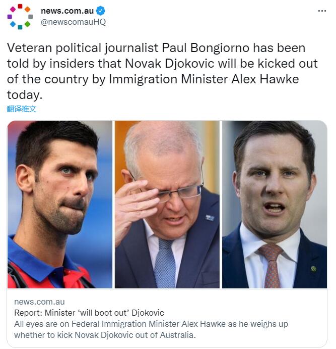 最新的消息显示,记者保罗-邦吉奥尔诺发文表示:我听说霍克部长将在1月13日把那个小丑赶出去(驱逐离境),此外记者卡伦-斯威尼也认同了这一报道。如果不出意外,这位澳网9冠王,将以一种极为不体面的方式,缺席本届澳网比赛。