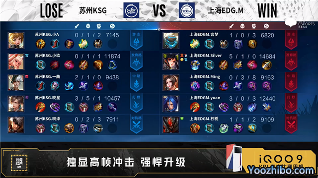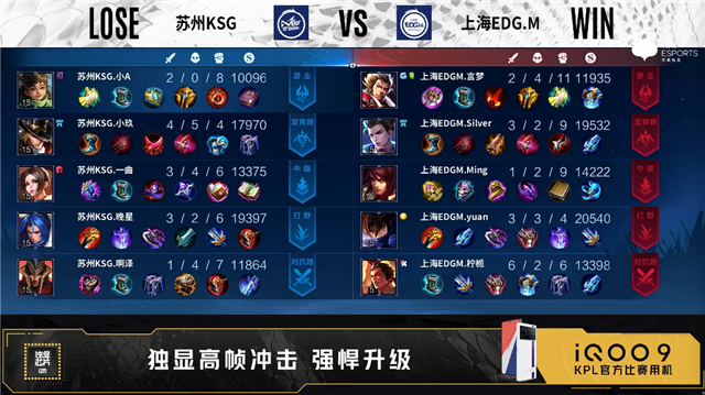 开局上海EDG.M孙尚香中路抢线。2分17秒苏州KSG拿下主宰,上海EDG.M拿下暴君。4分37秒苏州KSG主宰处打出0换2。5分13秒苏州KSG中路击杀孙尚香。5分27秒上海EDG.M中路击杀暃。10分23秒上海EDG.M中路打出0换2。12分18秒上海EDG.M摧毁敌方中路二塔。13分40秒双方野区1换1。15分01秒苏州KSG孙膑抢到暗影主宰。16分32秒中路团战上海EDG.M打出1换5,孙尚香拿到三连决胜。16分56秒上海EDG.M摧毁敌方水晶拿下比赛。