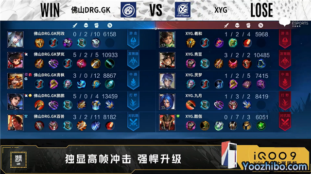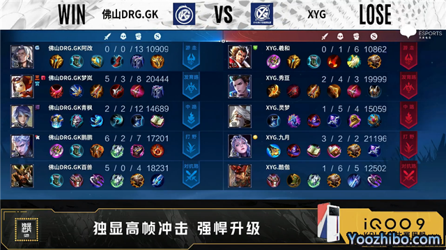 开局XYG蒙犽中路抢线。1分11秒XYG弈星发育路单杀李元芳拿到一血。2分28秒佛山DRG.GK对抗路击杀蒙恬。4分10秒XYG拿下暴君。4分20秒佛山DRG.GK野区击杀蒙恬。5分50秒中路上河道团战双方1换1。6分33秒中路上河道团战双方1换1。6分50秒佛山DRG.GK摧毁敌方对抗路二塔。7分03秒佛山DRG.GK拿下主宰。7分54秒佛山DRG.GK对抗路击杀橘右京。8分27秒佛山DRG.GK中路越塔打出0换2。9分39秒XYG野区击杀李元芳。10分24秒野区团战主宰处团战佛山DRG.GK打出0换4。11分02秒佛山DRG.GK摧毁敌方中路高地塔。12分58秒高地团战XYG打出1换2,佛山DRG.GK摧毁敌方发育路高地塔。14分11秒野区团战佛山DRG.GK打出0换4。14分40秒佛山DRG.GK摧毁敌方水晶拿下比赛。