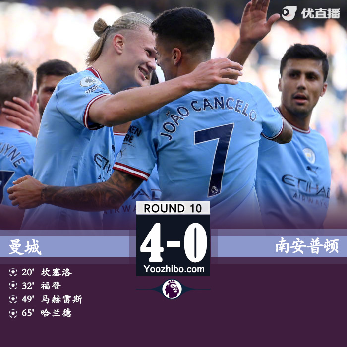 24直播网讯北京时间10月8日22:00,2022-23赛季英超联赛第10轮,曼城坐镇伊蒂哈德球场迎战南安普顿。上半场哈兰德单刀球中柱,坎塞洛建功,福登破门,曼城暂2-0南安普顿。下半场马赫雷斯进球,哈兰德再失单刀,随后他接到坎塞洛助攻取得进球,曼城4-0南安普顿。