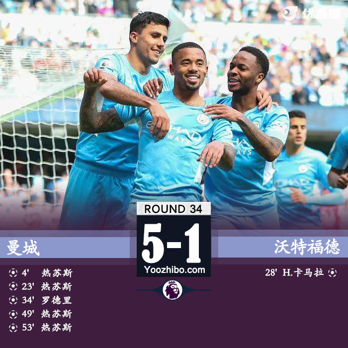 24直播网4月23日讯 北京时间4月23日22:00,英超联赛第34轮,曼城主场迎战沃特福德。上半场比赛,热苏斯头顶脚踢梅开二度,卡马拉低射远角扳回一城,罗德里世界波破门。下半场比赛,热苏斯造点并亲自主罚命中,随后接到德布劳内横传推射入网完成大四喜。最终全场比赛结束,曼城5-1战胜沃特福德,继续排名积分榜首位。