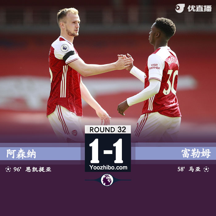 24直播网讯 北京时间4月18日晚上20:30,2020-21赛季英超第32轮,阿森纳主场迎战富勒姆。上半场,马丁内利屡失良机,塞巴略斯进球越位。半场战罢,阿森纳暂0-0富勒姆。下半场,加布里埃尔送点,马雅点射命中,拉卡泽特伤退,恩凯提亚读秒绝平。全场结束,阿森纳1-1富勒姆,距离欧冠区9分。