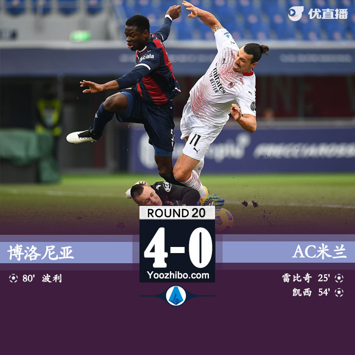 24直播网1月30日讯 北京时间1月30日晚22点整,2020-21赛季意甲第20轮在内拉托-达拉亚球场展开角逐,AC米兰客场挑战博洛尼亚。上半场伊布失点,雷比奇补射建功,下半场凯西点射扩大比分,波利面对旧主破门。最终AC米兰客场2-1战胜博洛尼亚,米兰连续17个意甲客场不败刷新纪录。积分榜方面,米兰积46分继续领跑。