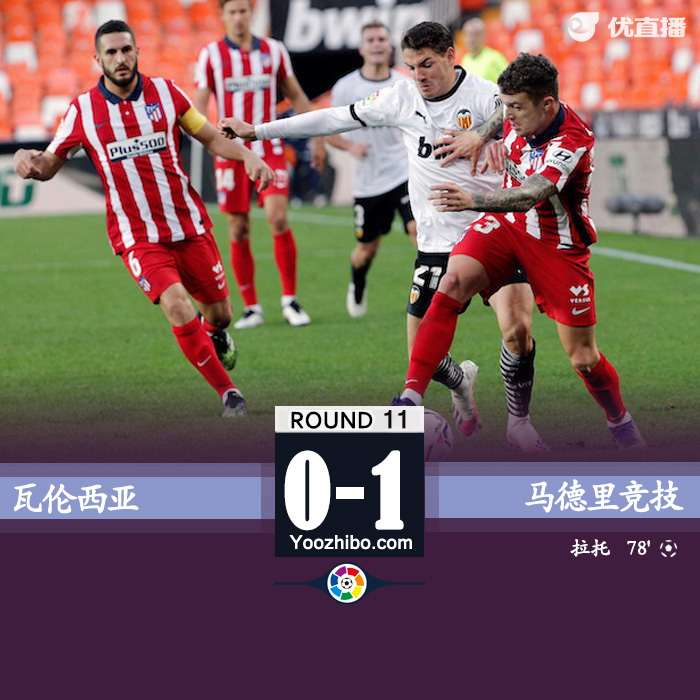 24直播网讯:北京时间11月28日23:15分进行西甲联赛第11轮,瓦伦西亚主场对阵马德里竞技。上半场比赛,勒马尔两脚高质量射门都被多梅内克飞身扑出,奥布拉克扑出拉契奇近距离的推射以及勒马尔的解围。下半场比赛,卡拉斯科传中造成拉托乌龙。全场比赛结束,马竞1-0战胜瓦伦西亚,取得联赛六连胜,少赛一轮的情况下23分追平联赛头名皇家社会,排名联赛第2。