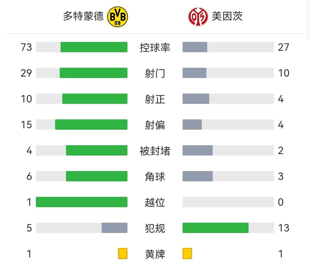 多特蒙德首发:1-格雷戈-科贝尔、26-赖尔森(80'20-莫德斯特)、15-胡梅尔斯、25-聚勒、13-格雷罗、23-埃姆雷-詹、17-马里乌斯-沃尔夫(46'18-穆科科)、19-布兰特(62'16-迪朗维尔)、21-马伦(62'7-雷纳)、27-阿德耶米(40'11-罗伊斯)、9-阿莱