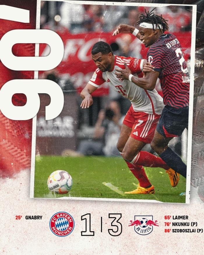 随后第76分钟,恩昆库早点,并且亲自主罚命中完成反超。第86分钟,马兹拉维再次送点,索博斯洛伊主罚命中将比分锁定为3-1。当败局已定后,拜仁球迷在比赛还没结束时就纷纷提前退场抗议。拜仁球迷知道,这场失利或许会让他们丢掉已经连续染指了10年的德甲冠军。