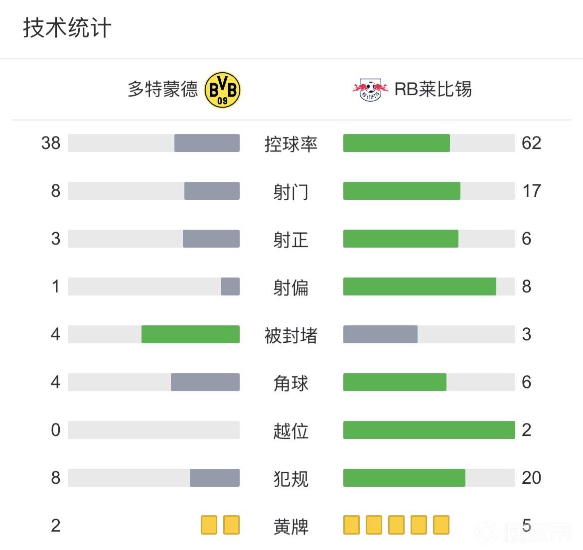 最终多特主场2-1击败莱比锡,取得联赛8连胜,暂时升至德甲榜首。