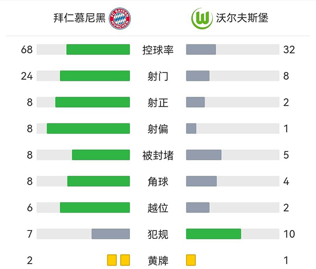 最终全场比赛结束,拜仁慕尼黑2-0战胜沃尔夫斯堡。