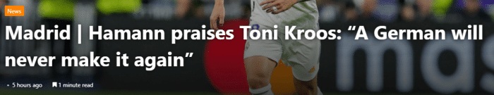 克罗斯是世界杯冠军和五届欧冠冠军。哈曼在天空电视台的专栏中写道:“如果我们列举德国足球的绝对精英,我们会提起贝肯鲍尔、席勒和马特乌斯,我认为克罗斯紧随其后。不会有德国人再取得这样的成就了(五座欧冠)。”