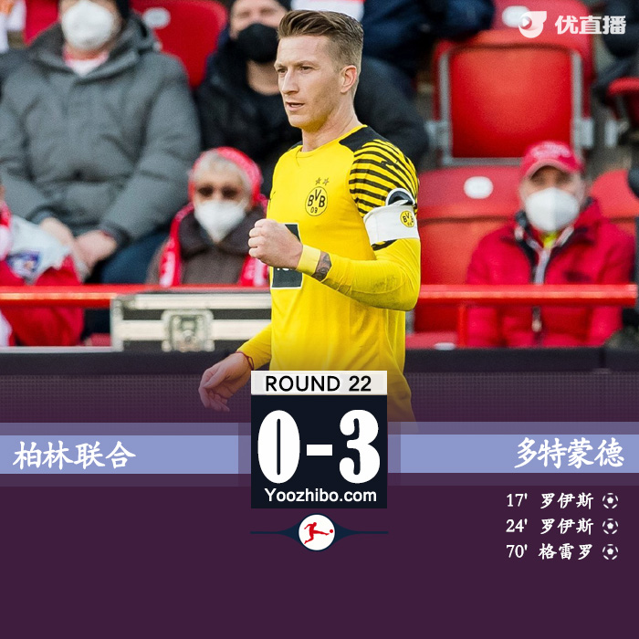 第26分钟,多特再下一城!扎加杜后场长传克诺赫争顶失误罗伊斯左路拿球杀入禁区内过掉门将打门球进。多特客场2-0柏林联。