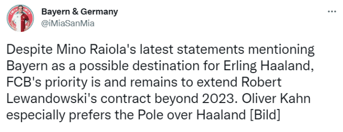 《图片报》表示,尽管拉伊奥拉在最近的采访中表示拜仁是哈兰德的潜在下家,但拜仁目前的首要目标依然是与莱万续约,这位波兰前锋的合同将在2023年到期。