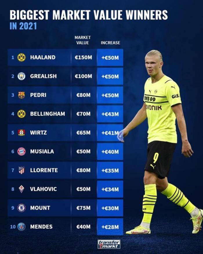 德转盘点今年球员身价涨幅榜:哈兰德5000万欧
