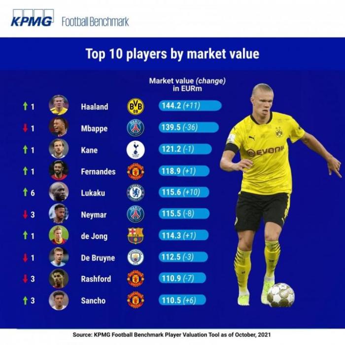哈兰德在最新的排名中力压此前排名第一的姆巴佩。前10名中上升幅度最大的是卢卡库,他的排名上升了6位,身价达到1.156亿欧,上涨1000万。