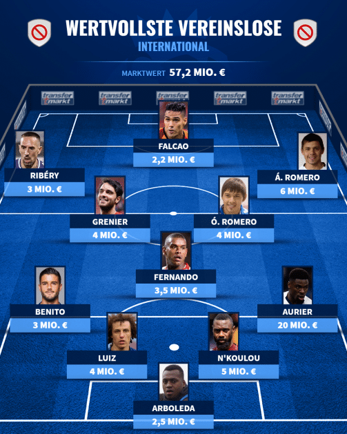 如图,门将位置上是身价阿尔博莱达;后防线上四人分别是贝尼托、大卫路易斯、恩库卢和奥利耶;中场分别是费尔南多,格尼尔和罗梅罗,前锋线上分别是前拜仁七号,A罗梅罗和法尔考。当然,除了这些球员以外,还有很多优秀的自由球员,比如前曼联后卫拉斐尔,前阿森纳中场威尔谢尔,前曼城后卫曼加拉,前切尔西中场马林,前切尔西中场拉米雷斯,前利物浦前锋斯图里奇等等,他们目前都是自由身。