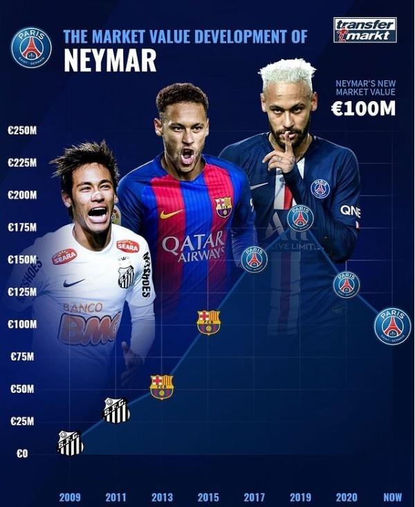 2017年夏天,巴黎支付2.2亿欧将内马尔从巴萨带走。在那之后,内马尔的身价曾达到1.8亿欧,不过最近两年他的身价持续下滑,现在已下滑至1亿欧,两年间缩水了8000万欧。