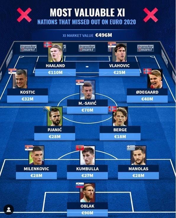 24直播网讯 , 德国转会市场列出了未能进入欧洲杯各国球员的最贵阵容,挪威前锋哈兰德以1.1亿居首,11人的总身价高达4.96亿欧。