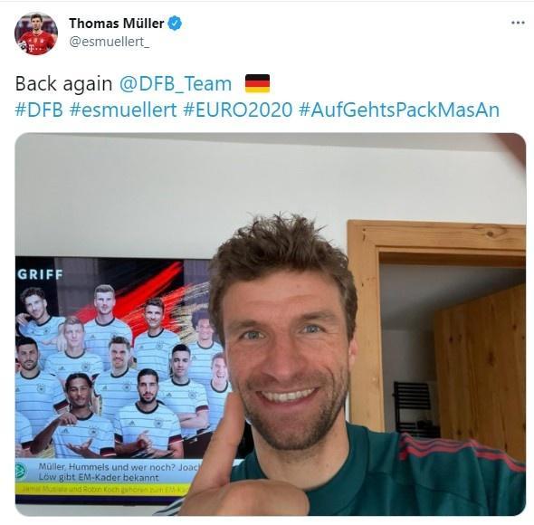 24直播网讯 北京时间今天,德国国家队公布了欧洲杯大名单,穆勒回归。随后穆勒更新了社交媒体,表示庆祝。