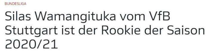 24直播网讯北京时间5月18日,德甲联赛官方宣布,斯图加特边锋瓦曼吉图卡当选赛季最佳新秀。
