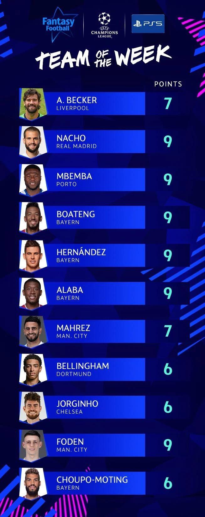 后卫:纳乔(皇马),姆本巴(波尔图),博阿滕(拜仁),卢卡斯-埃尔南德斯,阿拉巴(拜仁)