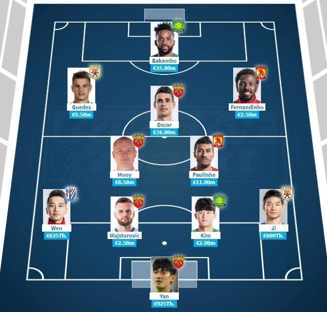中场:穆伊(上海海港)、保利尼奥(广州队)、格德斯(山东泰山)、奥斯卡(上海海港)、费南多(广州队)