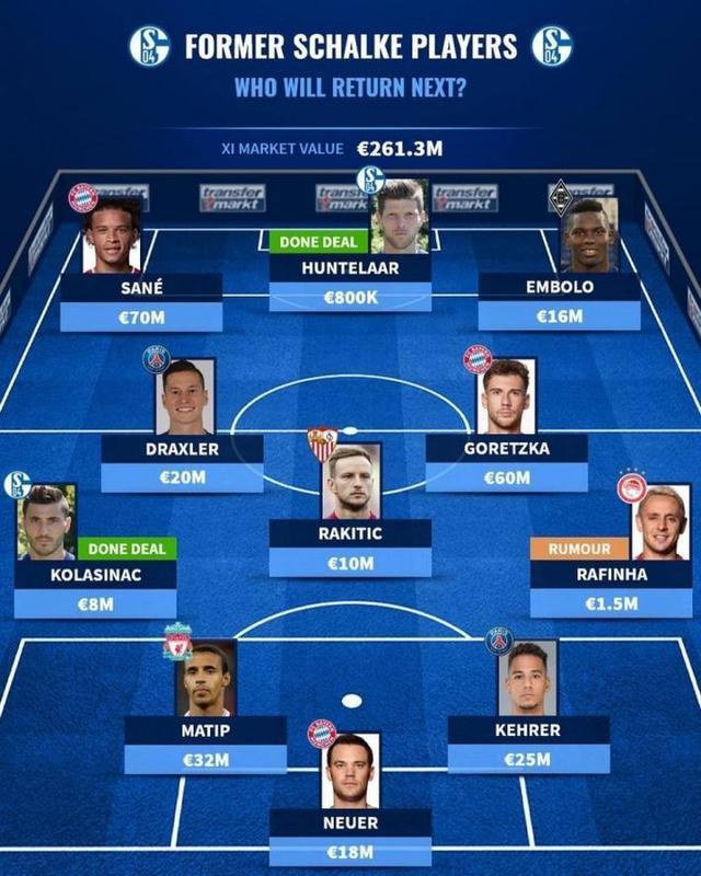 本赛季,沙尔克深陷降级区,在迎回两位旧将后,德转也评选出了现役沙尔克旧将阵容。具体阵容如下: