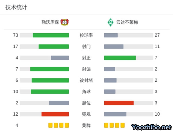 第7分钟,不莱梅取得领先,勒沃库森后场传球出现失误,斯塔格禁区内横敲,施密德面对赫拉德茨基打门得手,不莱梅1-0领先勒沃库森。
