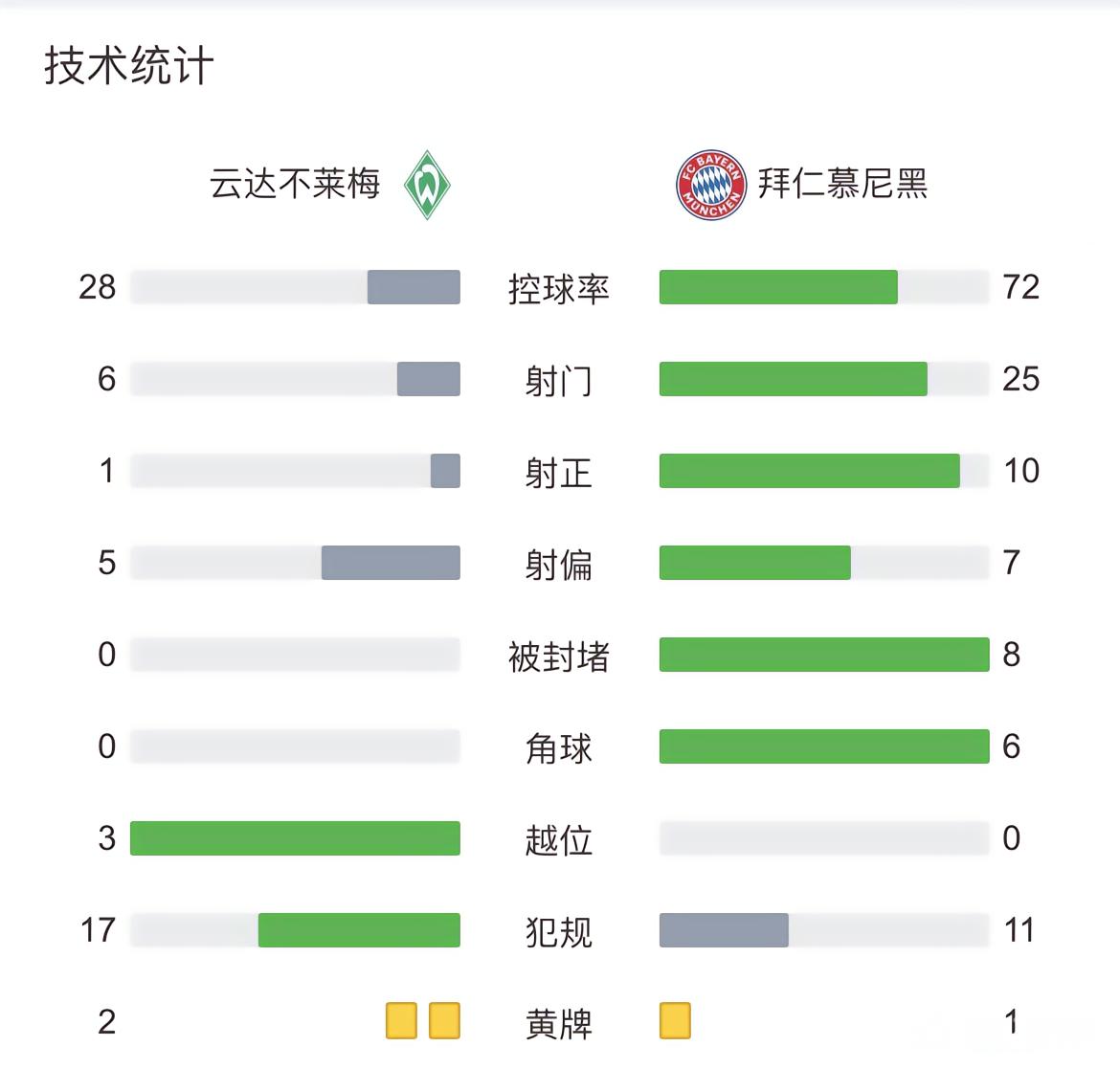 第4分钟,拜仁后场断球,萨内与凯恩打出配合,随后跑出单刀球机会,面对帕夫伦卡一脚推射得手,拜仁1-0不莱梅。