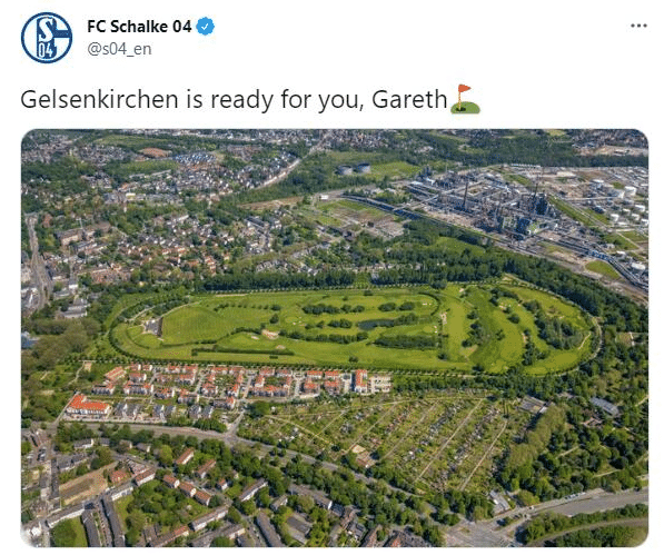 24直播网讯 沙尔克04上赛季在德甲垫底,新赛季只能去踢德乙。但他们的官推还是晒出了一大片高尔夫球场的鸟瞰图:“盖尔森基兴为你准备好了,贝尔!”