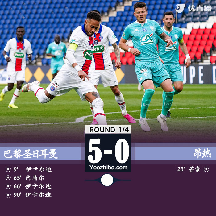 巴黎5-0昂热晋级半决赛 内马尔破门+造乌龙二弟戴帽