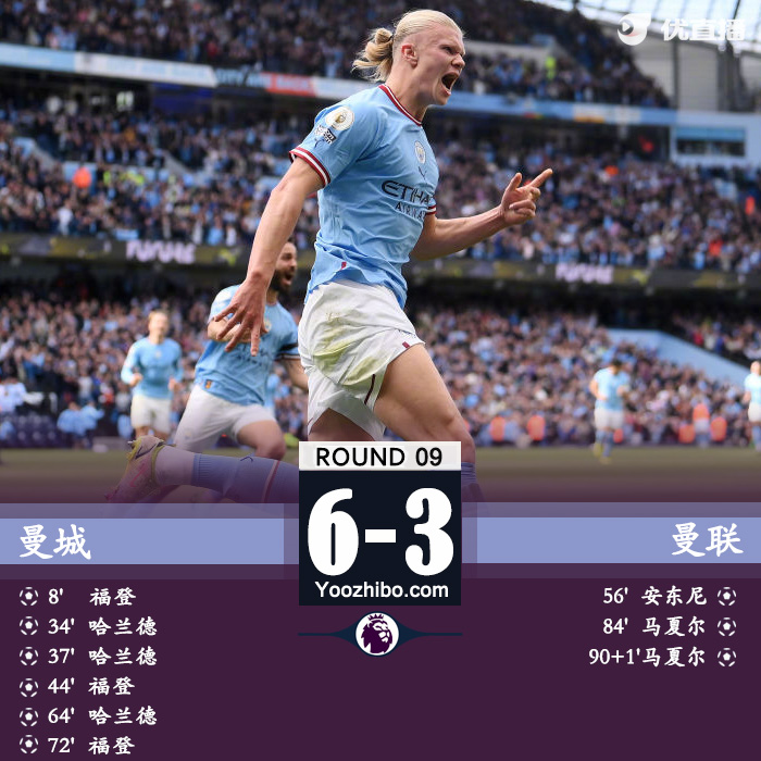 24直播网讯北京时间今天21:00,英超第九轮迎来焦点战,第188场曼市德比,曼城坐阵伊蒂哈德球场迎战曼联。上半场B席助攻福登破门,京多安任意球中柱,哈兰德头球破门后铲射破门完成双响,随后哈兰德助攻福登再下一城,半场曼城四球领先。下半场回来安东尼世界波扳回一城,哈兰德破门完成帽子戏法,随后哈兰德助攻福登进球完成帽子戏法,马夏尔门前补射破门,终场前坎塞洛送点,马夏尔点射完成双响。全场结束曼城6-3击败曼联拿下第188次曼市德比的胜利。