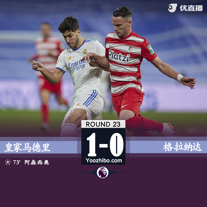 24直播网2月7日讯 北京时间2月7日04:00,西甲第23轮继续进行,皇家马德里主场迎战格拉纳达。上半场,卡瓦哈尔横传,内瓦解围打在自家横梁上险些造成乌龙球。下半场,阿森西奥打入一脚世界波帮皇马取得领先。最终,皇马1-0战胜格拉纳达,6分优势继续领跑积分榜。