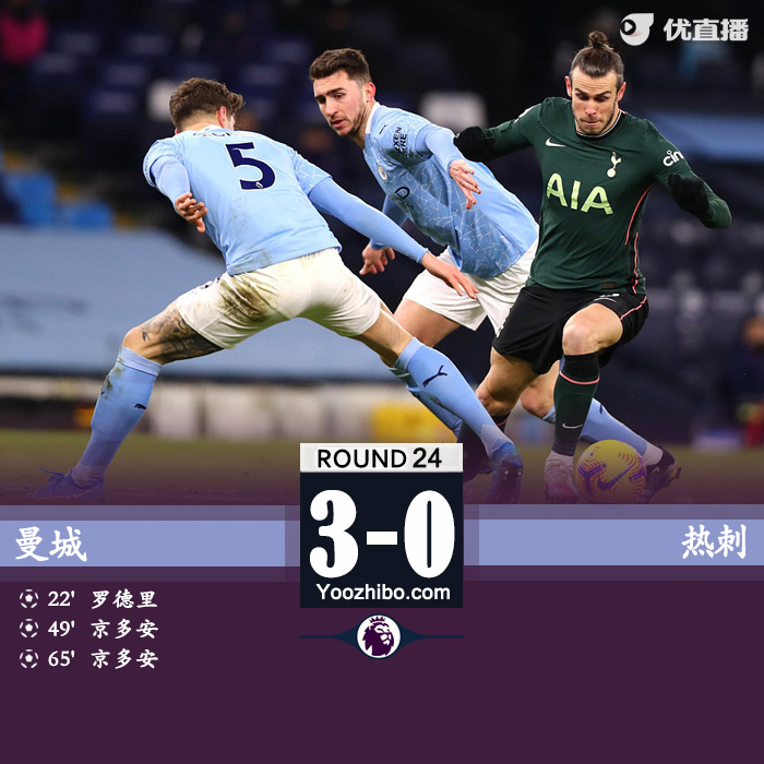 24直播网2月14日讯 北京时间2月14日凌晨1点30分,2020-21赛季英超第24轮的焦点战在伊蒂哈德球场展开角逐,曼城坐镇主场迎战热刺。上半场凯恩任意球中框,罗德里点射打破僵局,下半场京多安梅开二度后伤退,埃德森献助攻。最终曼城主场3-0完胜热刺,蓝月亮豪取各项赛事16连胜,热刺近6场输掉5场。积分榜方面,曼城积53分继续领跑,热刺积36分位居第8名。