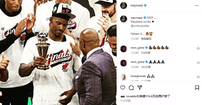 内马尔在社交媒体上送上祝福,他恭喜巴特勒:MVP!祝贺我的兄弟。
