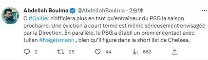来源:24直播网04-06 16:4424直播网04月06日讯 ,来自法国知名记者Abdellah Boulma的透露,巴黎圣日耳曼俱乐部正在考虑现在就解雇主帅加尔蒂,而不是等到今年夏天赛季结束后再换帅。而在解雇加尔蒂后,大巴黎考虑邀请赋闲在家的德国少帅纳格尔斯曼接任。