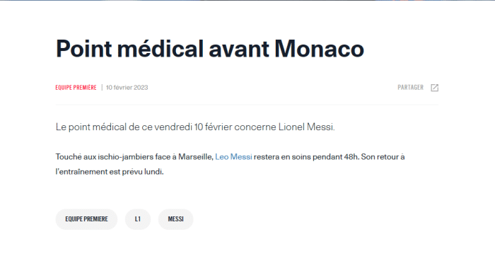 24直播网讯02月11日巴黎圣日耳曼俱乐部官方发布有关梅西伤情公告,梅西因腿筋受伤,将缺席对阵摩纳哥比赛,下周一重返训练。